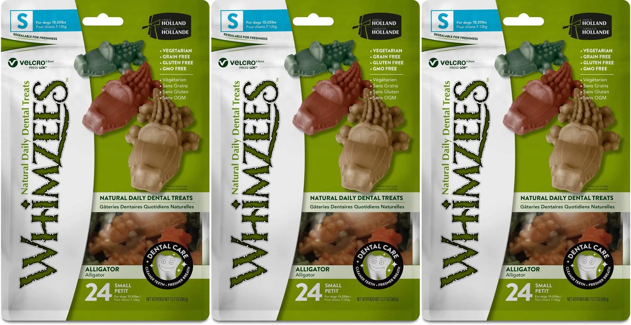 xIntroduce your beloved canine to a world of oral hygiene with Whimzees 3 Pack of Alligator Dog Dental Chews. Each pack contains 24 delightful treats designed to promote a fun and effective dental care routine.